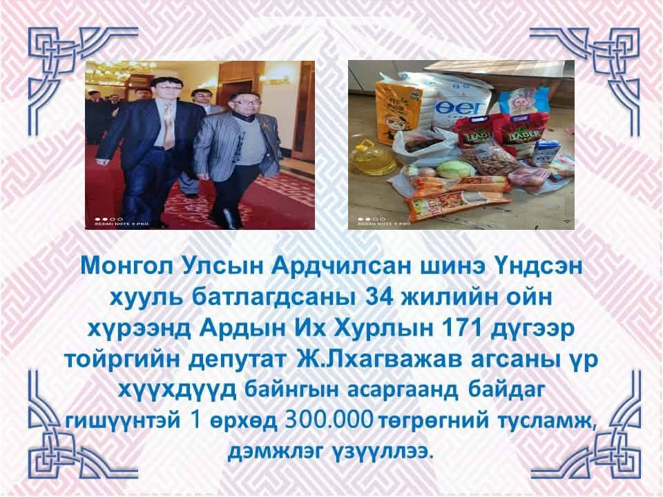Мөн энэ өдөр Ж.Лхагважав агсны үр хүүхдүүд, тус сумын байнгын асаргаанд байдаг гишүүнтэй 1 өрхөд 300,0 мянган төгрөгийн тусламж дэмжлэг үзүүллээ.