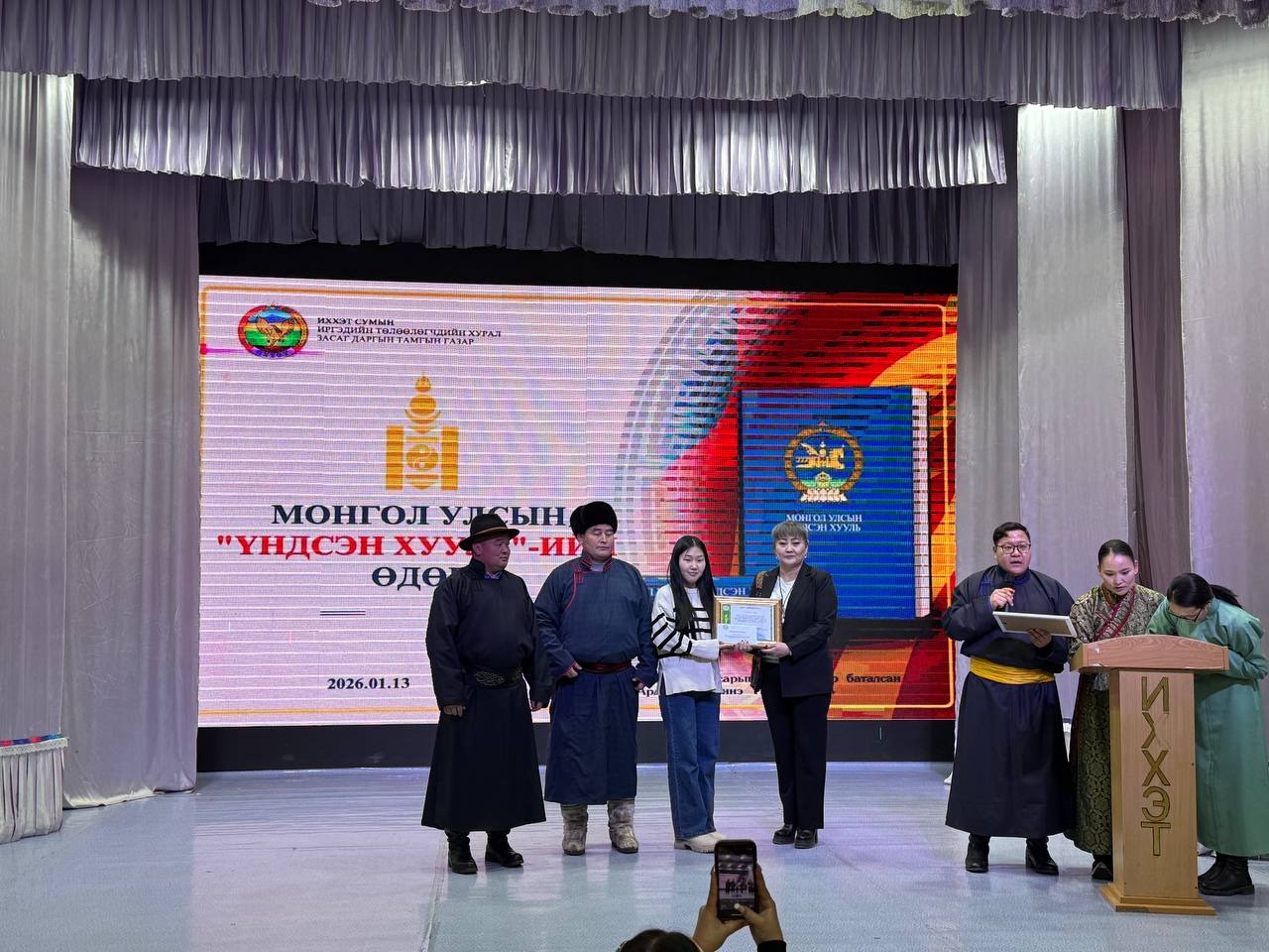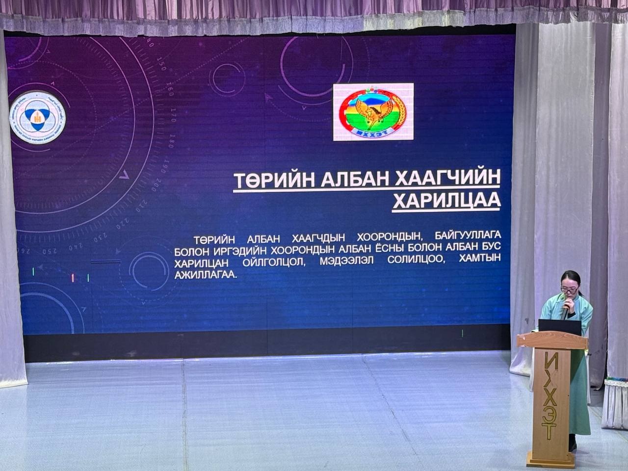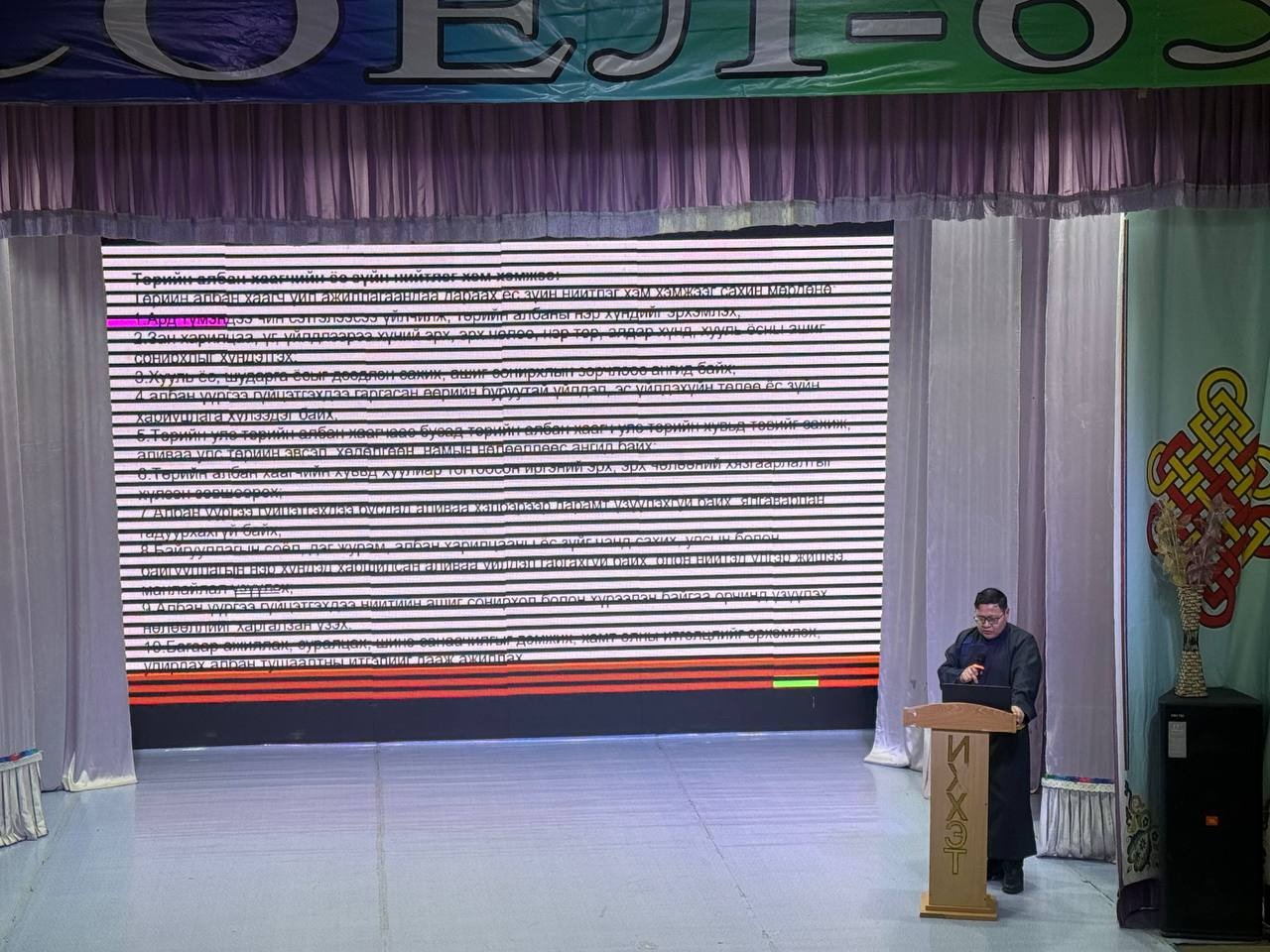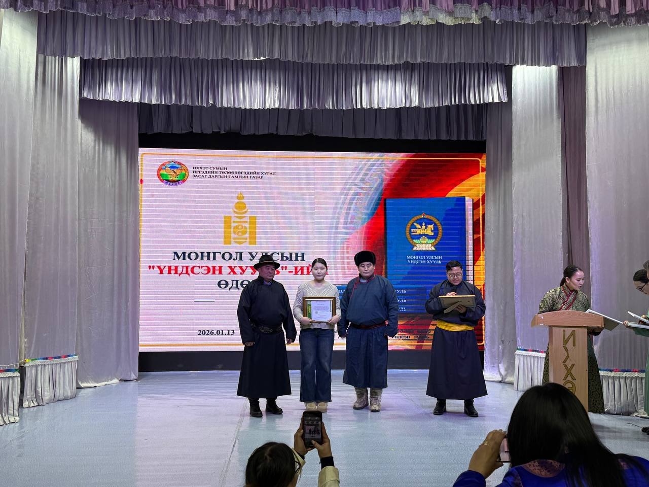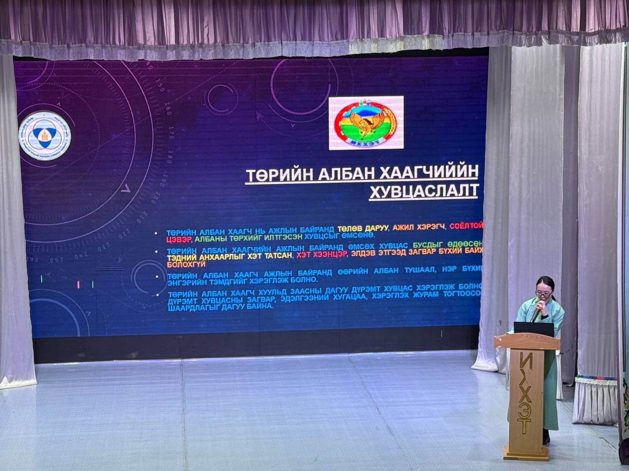 Өдөрлөгийн арга хэмжээн дээр “Үндсэн хуулийн танилцуулга, ач холбогдол” сэдвээр сумын Засаг даргын Тамгын газрын Хууль, эрх зүйн мэргэжилтэн Б.Мөнхсаруул, Төрийн албаны ёс зүйн тухай хуулиар сумын Засаг даргын Тамгын газрын Ёс зүйн дэд хорооны дарга А.Даваадорж, Төрийн албаны үйл ажиллагаанд тавих ерөнхий шаардлага, стандартын талаар Хууль, эрх зүйн мэргэжилтэн Б.Мөнхсаруул нар тус тус мэдээлэл танилцууллаа.