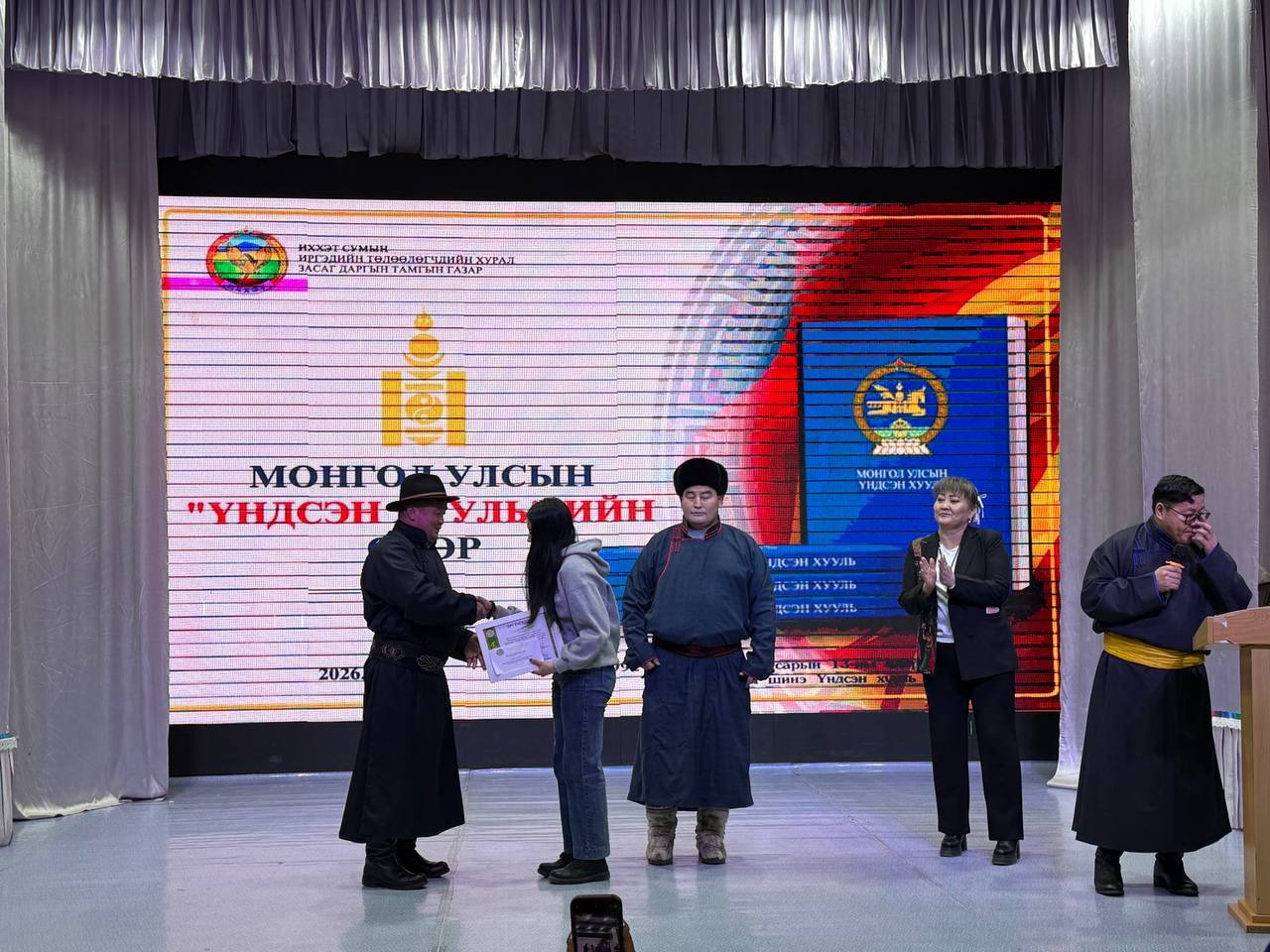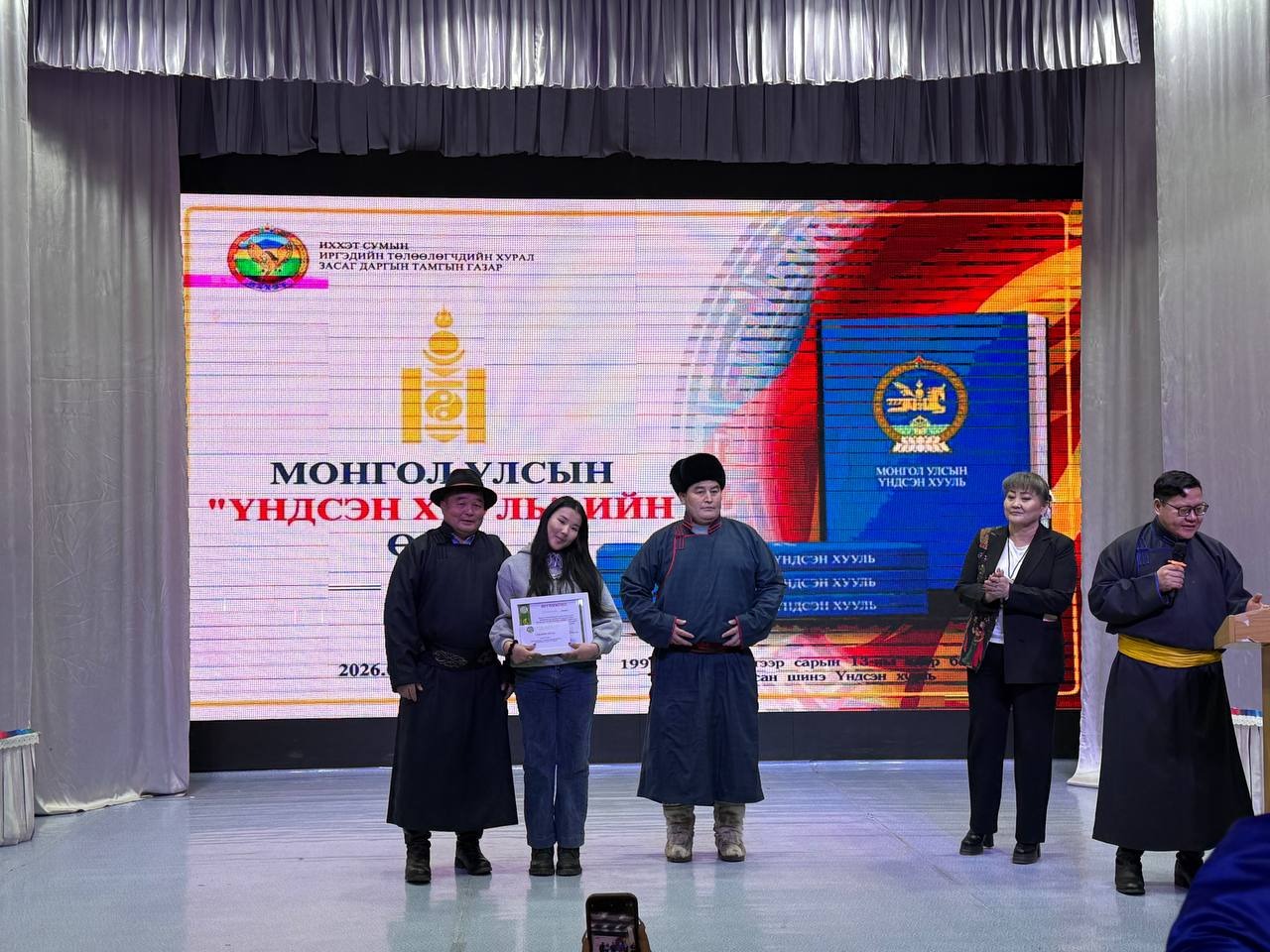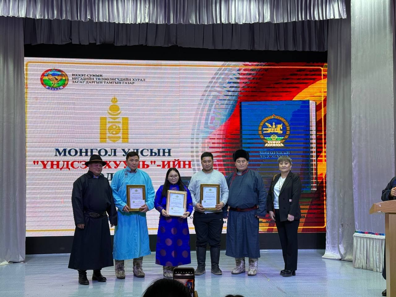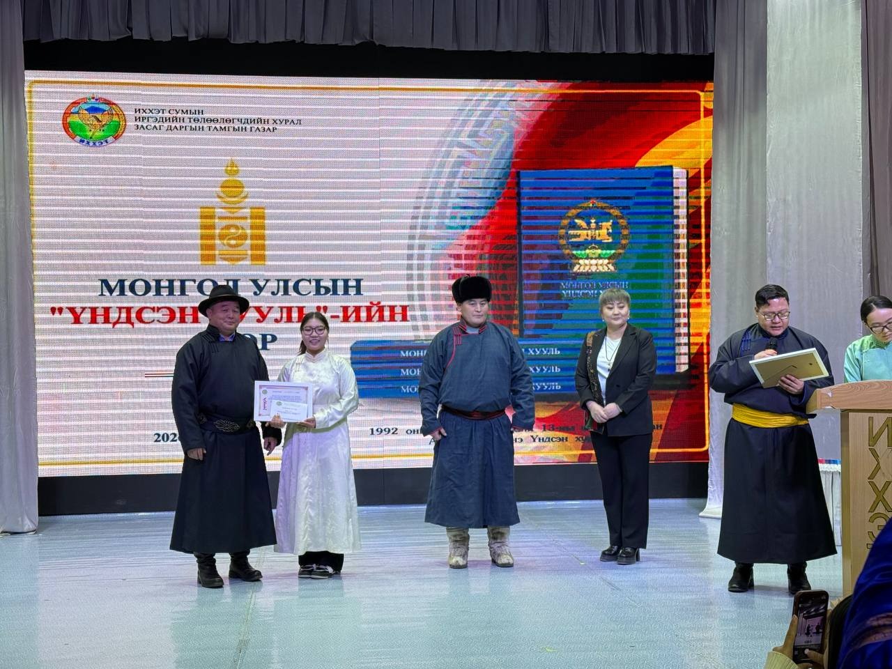 Өдөрлөгийн арга хэмжээний үеэр Монгол Улсын үндсэн хуулийн өдрийг угтан ЕБС-ийн дунд, ахлах ангийнханы дунд зарласан “Хүний эрх-Эрх чөлөө” сэдэвт “Эссэ” бичлэгийн уралдаан, төрийн албан хаагчид болон иргэдийн дунд зарласан Үндсэн хуулиа үндэсний бичгээрээ бичих “Үндэсний бичгийн сайхан бичигтэн” уралдаанд шалгарсан иргэдэд шагналыг гардууллаа.